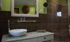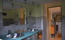 Sa salle de bain design ,douche et vasque, sèche serviettes, sèche cheveux,sol en galets.fenêtre sur les champs…..
